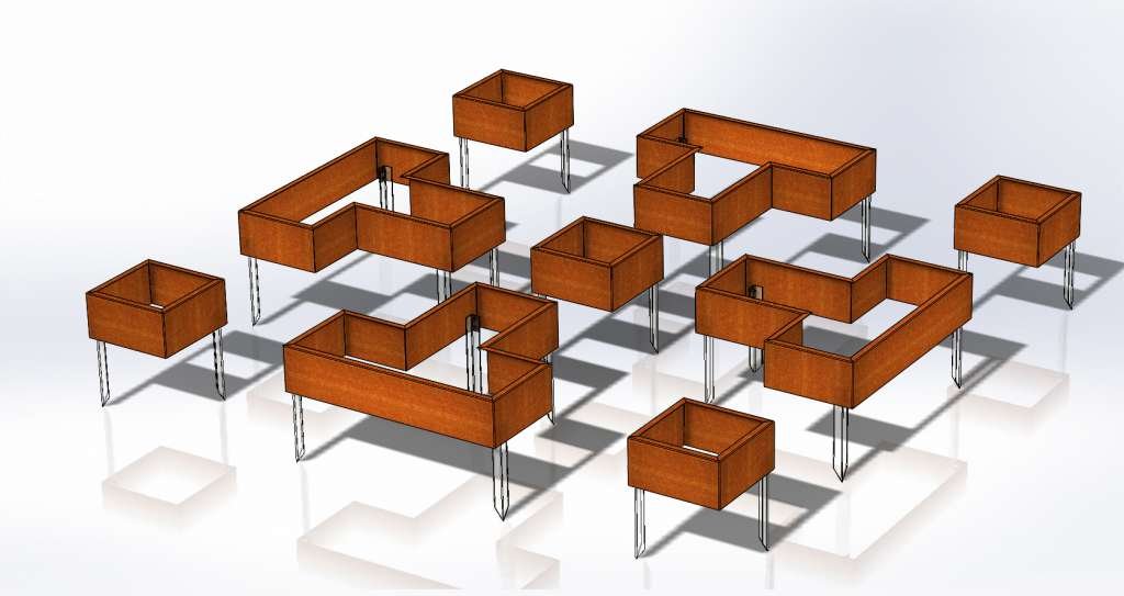A kompozíció különálló, teljesen hegesztett elemekből áll, amelyeket a talajra helyezünk, majd fém cövekekkel rögzítünk (a cövekeket a földbe verjük, és csavarokkal erősítjük a Corten elemekhez). A kompozíció minden eleme hajtott éllel készül, ami tovább növeli a termék esztétikai megjelenését.