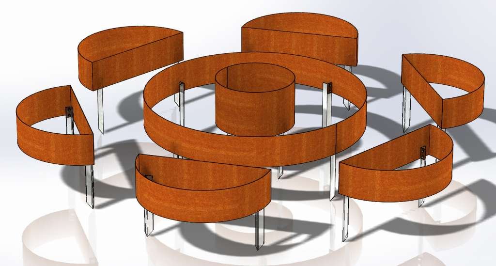 Egyedülállóan szép kompozíció, amely különálló, teljesen hegesztett elemekből áll. Az összes elemet a talajra helyezzük, és fém cövekekkel rögzítjük (a cövekeket a földbe verjük, majd csavarokkal erősítjük a Corten acél elemekhez).