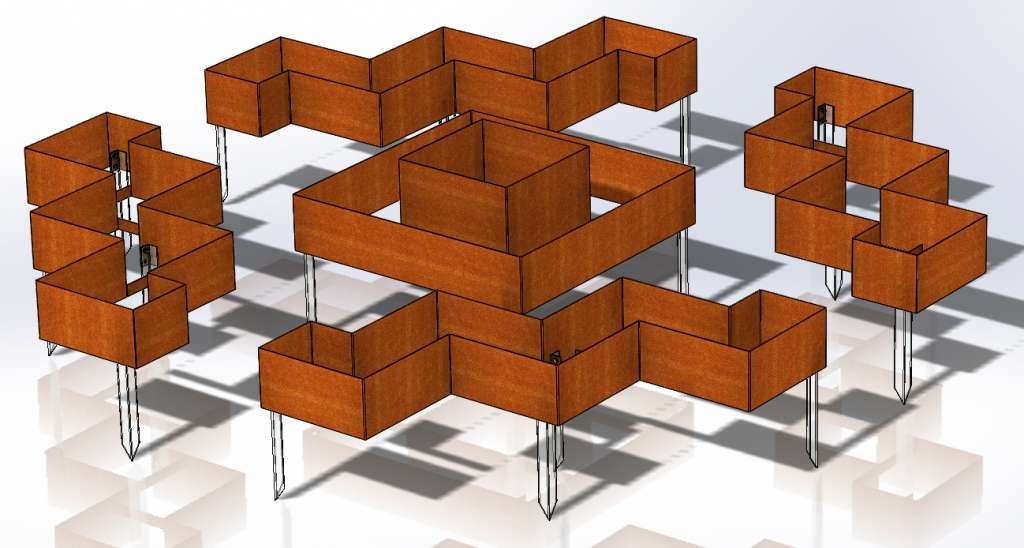 Egyedülállóan szép kompozíció, amely különálló, teljesen hegesztett elemekből áll. Az elemeket a talajra helyezzük, majd fém cövekekkel rögzítjük (a cövekeket a földbe verjük, és csavarokkal erősítjük a Corten acél elemekhez).