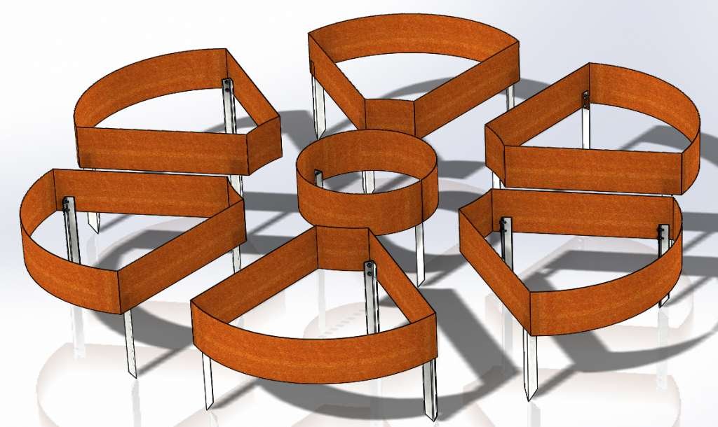 Egyedülállóan szép kompozíció, amely különálló, teljesen hegesztett elemekből áll. Az elemeket a talajra helyezzük, majd fém cövekekkel rögzítjük (a cövekeket a földbe verjük, és csavarokkal erősítjük a Corten acél elemekhez).
