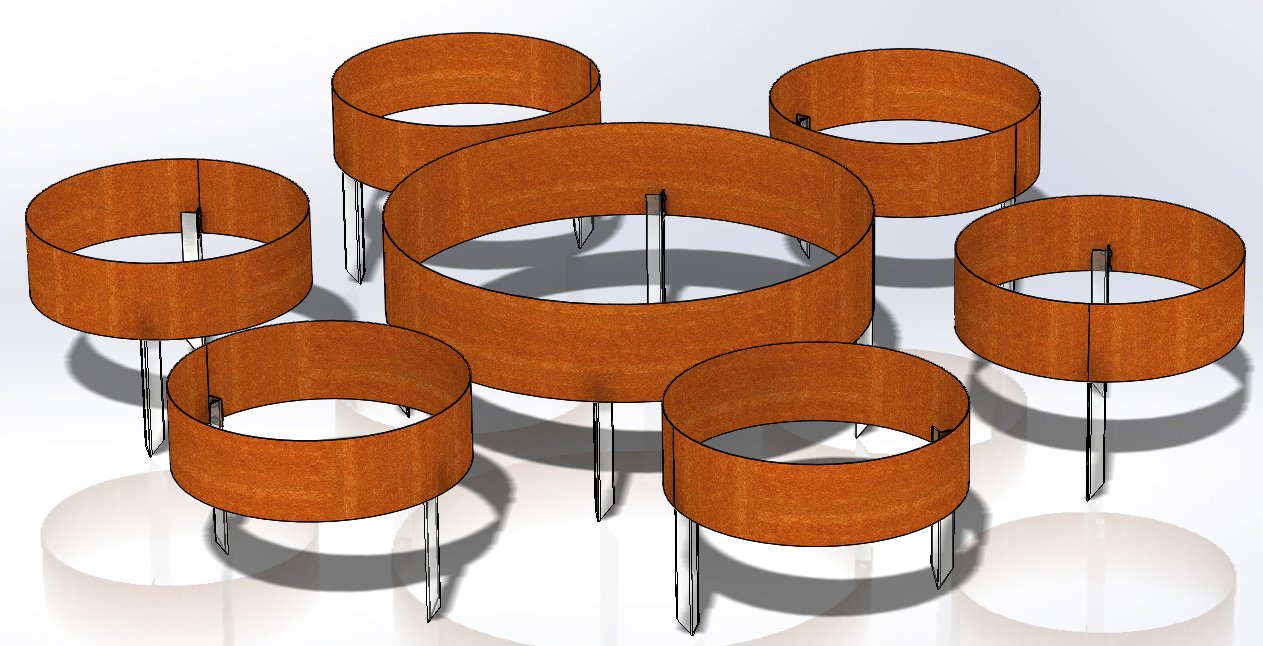 A kompozíció különálló, teljesen hegesztett elemekből áll, amelyeket a talajra helyezünk, és fém cövekekkel rögzítünk (a cövekeket a földbe verjük, majd csavarokkal erősítjük a Corten elemekhez).