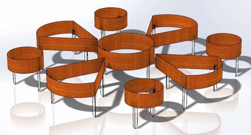 A kompozíció különálló, teljesen hegesztett elemekből áll, amelyeket a talajra helyezünk, majd fém cövekekkel rögzítünk (a cövekeket a földbe verjük, és csavarokkal erősítjük a Corten acél elemekhez).