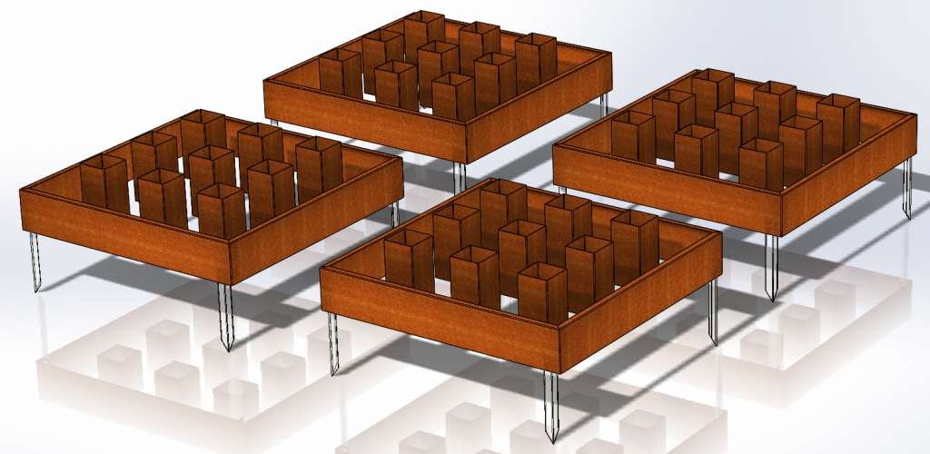 Egyedülállóan szép kompozíció, amely különálló, teljesen hegesztett elemekből áll. Az összes elemet a talajra helyezzük, majd fém cövekekkel rögzítjük (a cövekeket a földbe verjük, és csavarokkal erősítjük a Corten elemekhez).