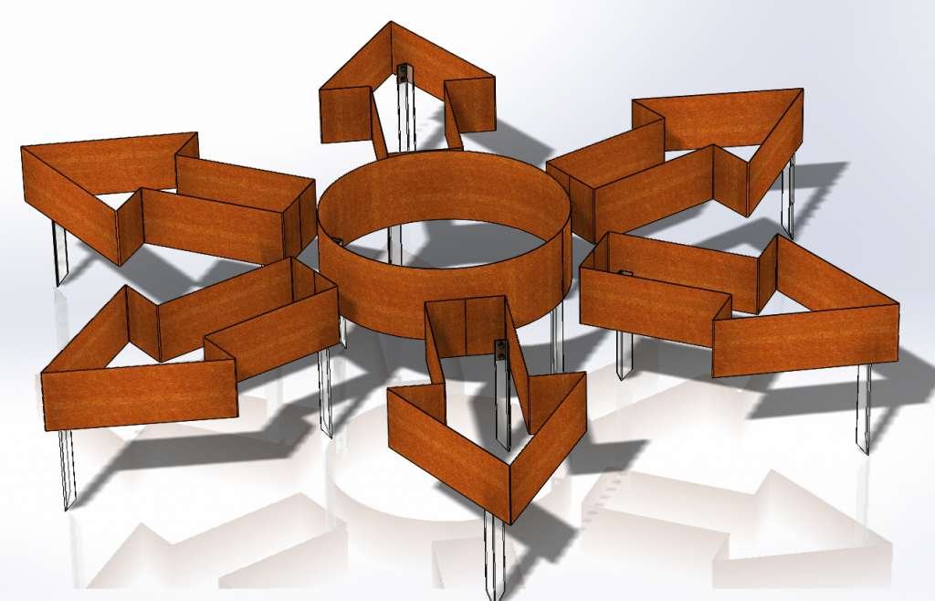 Egyedülállóan szép kompozíció, amely különálló, teljesen hegesztett elemekből áll. Az összes elemet a talajra helyezzük, és fém cövekekkel rögzítjük (a cövekeket a földbe verjük, majd csavarokkal erősítjük a Corten acél elemekhez).