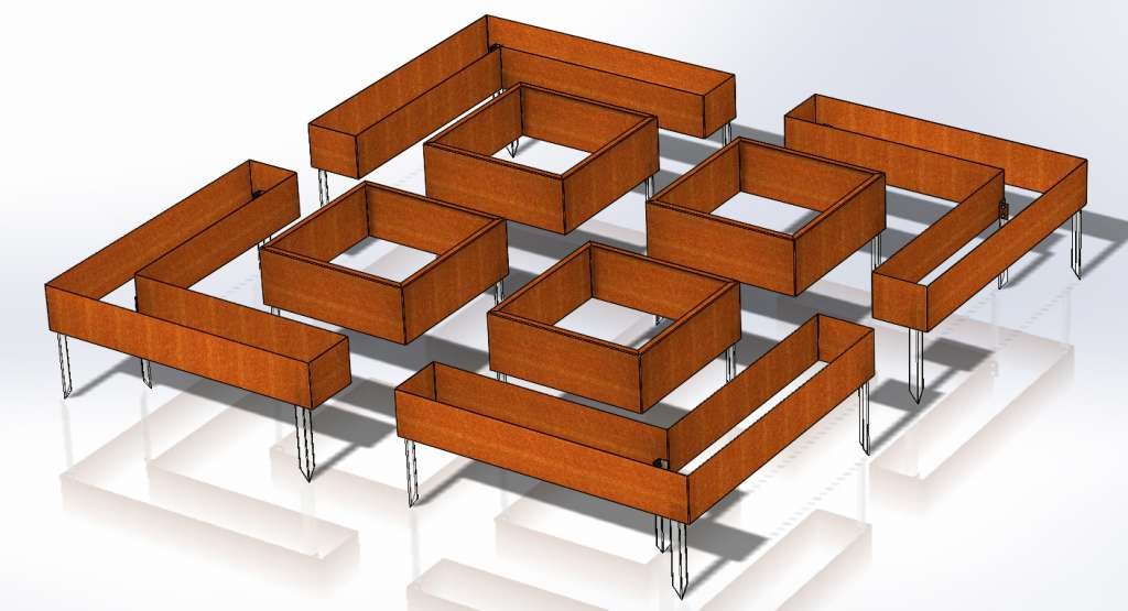 Egyedülállóan szép kompozíció, amely különálló, teljesen hegesztett elemekből áll. Az összes elemet a talajra helyezzük, és fém cövekekkel rögzítjük (a cövekeket a földbe verjük, majd csavarokkal erősítjük a Corten acél elemekhez).